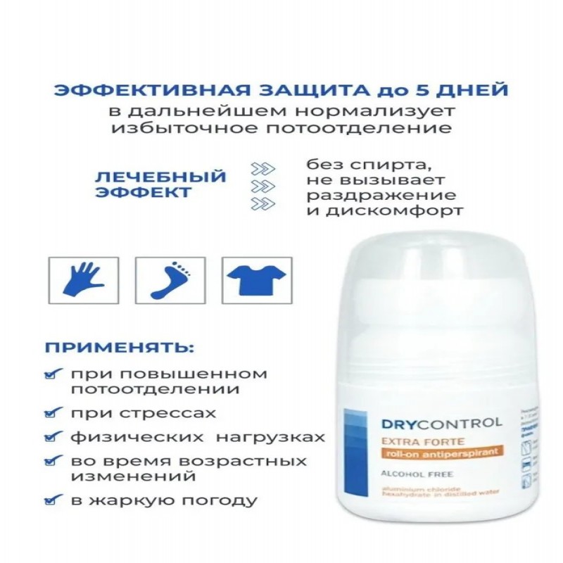 Состав Water, Aluminium Chlorohydrate, Aluminium Chloride Hexahydrate, Hydroxyethylcellulose DRYCONTROL- антиперспирант длительного действия на водной основе (не содержит спирт), позволяет значительно снизить, а при регулярном применении остановить избыточное потоотделение. Обеспечивает эффективную защиту от пота на срок до 5 дней. Произведено по ГОСТ. Произведено из европейских компонентов высокого качества. Не вызывает раздражение и дискомфорт.