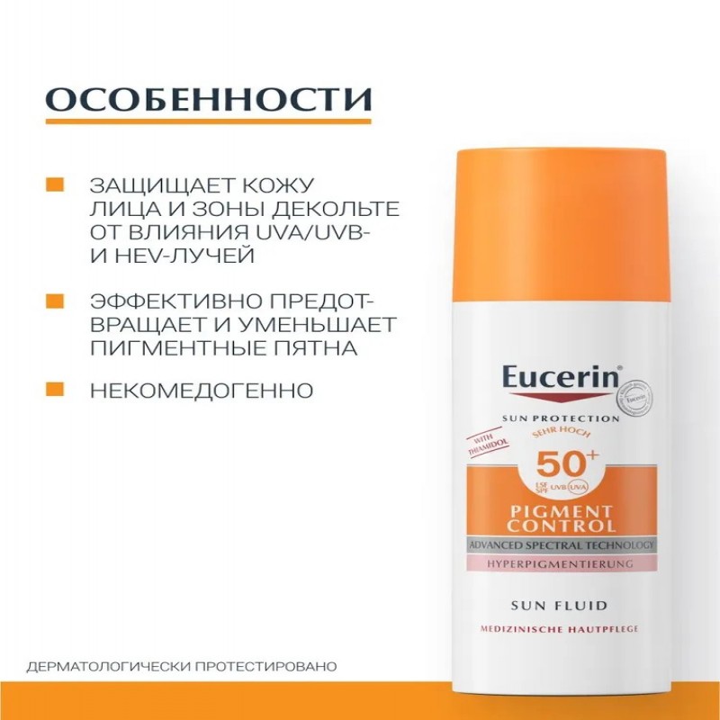 Солнцезащитный флюид против пигментации SPF 50+ Eucerin разработан для предотвращения провоцируемой солнцем гиперпигментации. Благодаря улучшенной спектральной технологии, сочетающей широкополосные и фотостабильные фильтры UVA/UVB* и ликохалкон А, флюид эффективно защищает от фотостарения и нейтрализует свободные радикалы, возникающие под воздействием солнечного излучения. В состав солнцезащитного крема также входит глицерретиновая кислота, стимулирующая собственные механизмы восстановления ДНК в клетках кожи. Продукт обогащен тиамидолом ― инновационным компонентом Eucerin, воздействующим на избыточную выработку меланина ― первопричину гиперпигментации. При регулярном использовании тиамидол уменьшает существующие пигментные пятна и предотвращает возникновение новых. Легкая текстура продукта быстро впитывается, не оставляя ощущения липкости и пленки. Результаты клинических исследований подтверждают безопасность солнцезащитного крема даже для людей с чувствительной кожей. Свойства: - легкая текстура - нелипкий - нежирный - быстро впитывается - некомедогенный - подходит под макияж - Соответствует высоким стандартам Ассоциации Cosmetics Europe в отношении защиты от UVA- и UVB-лучей. Уровень защиты от UVA-лучей выше рекомендованного в ЕС.