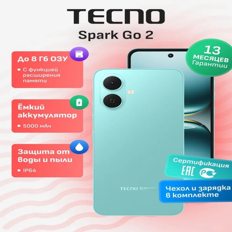 Tecno Смартфон SPARK GO 2 Ростест (EAC) 4/128 ГБ, зеленый