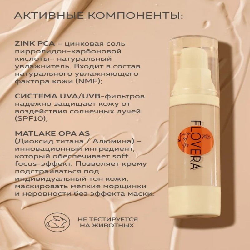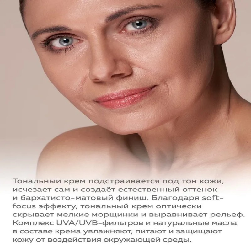 Благодаря soft-focus эффекту, тональный крем оптически скрывает мелкие морщинки, выравнивает рельеф и подстраивается под тон кожи. Комплекс UVA/UVB-фильтров, активных ингредиентов и натуральных масел в составе крема увлажняет, питает и защищает кожу от воздействия окружающей среды.