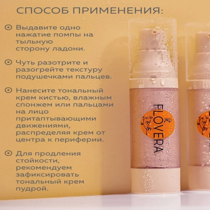 Применение: кистью/спонжем или руками распределите тональное средство, растягивая от центра к периферии.