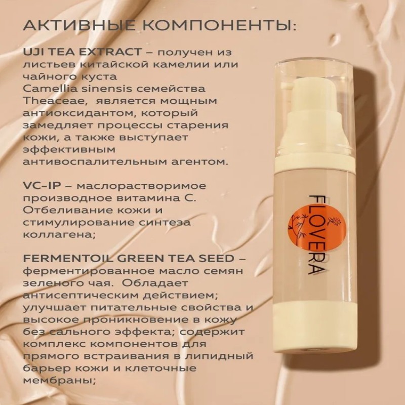 * Fermentoil Green Tea Seed – ферментированное масло семян зеленого чая. Обладает антисептическим действием; улучшает питательные свойства и высокое проникновение в кожу без сального эффекта; содержит комплекс компонентов для прямого встраивания в липидный барьер кожи и клеточные мембраны;