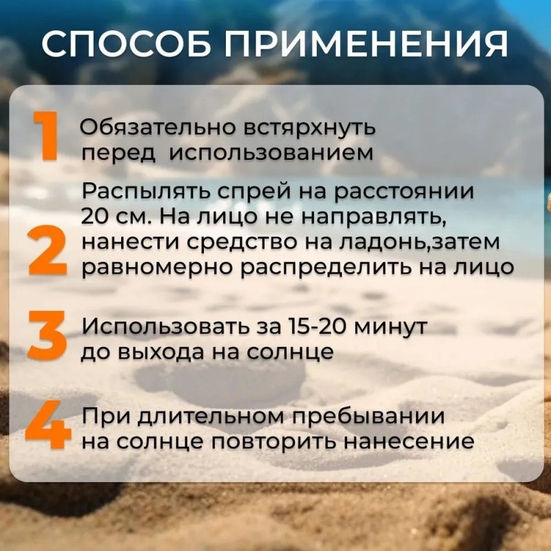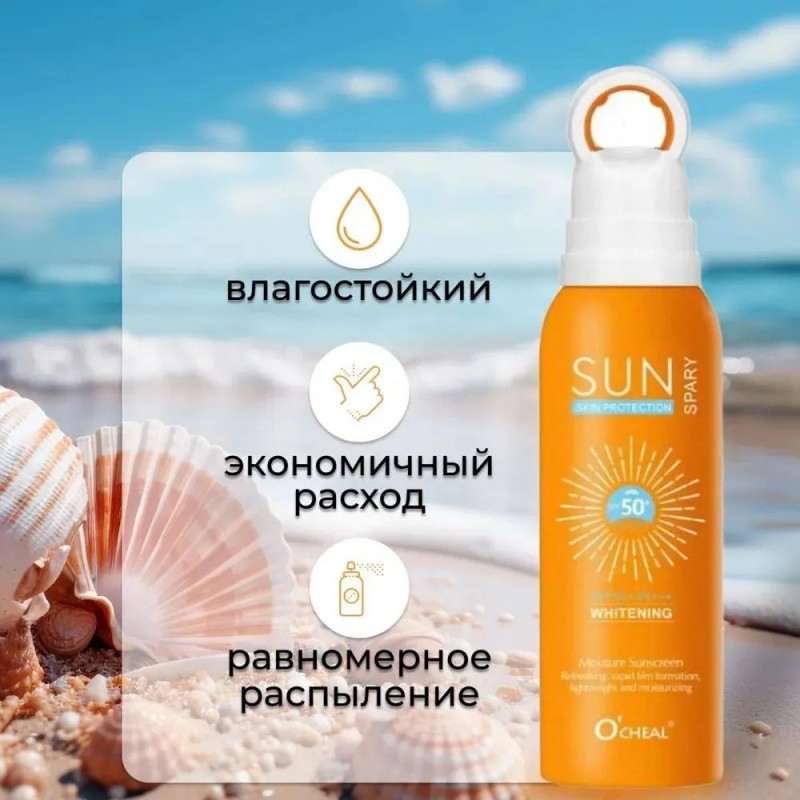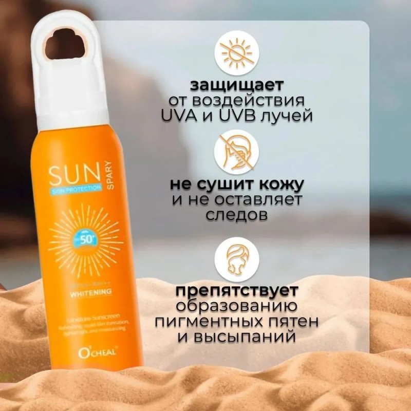 Представляем вам солнцезащитный крем-спрей для лица с уровнем защиты SPF 50! Этот уникальный продукт разработан специально для вашей кожи, обеспечивая надёжную защиту от вредных ультрафиолетовых лучей. Солнцезащитный спрей обладает лёгкой текстурой, которая мгновенно впитывается, не оставляя жирного блеска. Он идеально подходит для всех типов кожи, включая чувствительную и склонную к аллергии. Благодаря своей формуле, обогащённой натуральными компонентами, спрей-мист увлажняет и питает вашу кожу, делая её мягкой и ухоженной. Средство от загара спф 50 защищает от ультрафиолета, увлажнят кожу без ощущения липкости и фиксирует макияж. Предотвращает появление пигментных пятен и борется против пигментации. Убережет кожу от ожогов и избыточного загара. Солнцезащитный спрей аэрозоль для лица и тела парфюмированный отлично увлажняет, тонизирует тусклую увядшую кожу и придает ей мягкость и эластичность. Защищает от вредного воздействия солнца. Подходит для проблемной кожи склонной к высыпаниям, сухой кожи, жирной, нормальной и комбинированной. Защитный мист успокоит кожу после загара и восстановит баланс воды. Солнцезащитный спрей SPF 50+ Как и солнцезащитный крем только лучше! Солнцезащитный спрей позволяет защитить кожу от вредного воздействия солнечных лучей, помогает предотвратить преждевременное старение кожи, появление пигментных пятен и солнечных ожогов. Благодаря тщательно подобранному составу активных компонентов, солнцезащитное средство создает невидимый защитный барьер на поверхности кожи, который оставляет ее гладкой, увлажненной и защищенной в течение всего дня. Крем от загара обеспечивает долговременную защиту, предотвращает обезвоживание, шелушение, сухость и другие неприятные ощущения на коже. Спф для лица имеет легкую текстуру сухого распыления, которая мгновенно впитывается, не оставляя жирного блеска и позволяя коже дышать. Вы можете использовать его как самостоятельное средство или наносить перед макияжем, он прекрасно сочетается с любыми косметическими продуктами и не нарушает их долговременное действие. Не оставляет белых следов на коже, что обеспечивает невидимую защиту в любых условиях. Не содержит агрессивных ингредиентов, которые могут вызывать аллергическую реакцию. Важно применять солнцезащитный крем spf 50 перед выходом на солнце и поддерживать его эффективность, периодически обновляя его в течение дня. Крем также должен быть использован на всей обнаженной коже, включая лицо, шею, руки, ноги и другие открытые участки.