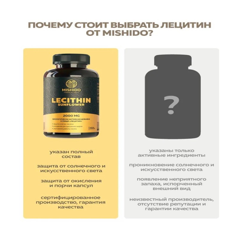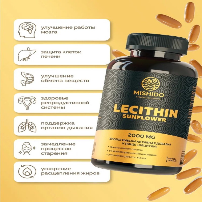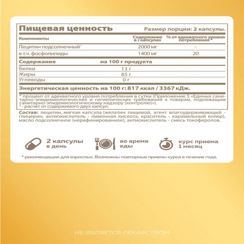 Капсулы массой 1500 мг. Содержание в 2 капсулах: Лецитин подсолнечный 2000 мг, в т.ч. фосфолипиды 1400 мг. Состав капсул: лецитин, мягкая капсула (желатин пищевой, агент влагоудерживающий - глицерин, антиокислитель - лимонная кислота, краситель - карамельный колер), масло подсолнечное (нерафинированное), антиокислитель - смесь токоферолов.