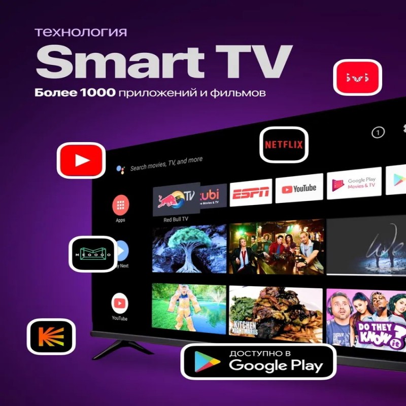 КомплектацияТелевизор - 1 шт Ножки - 2 шт Кабель питания - 1 шт Инструкция - 1 шт