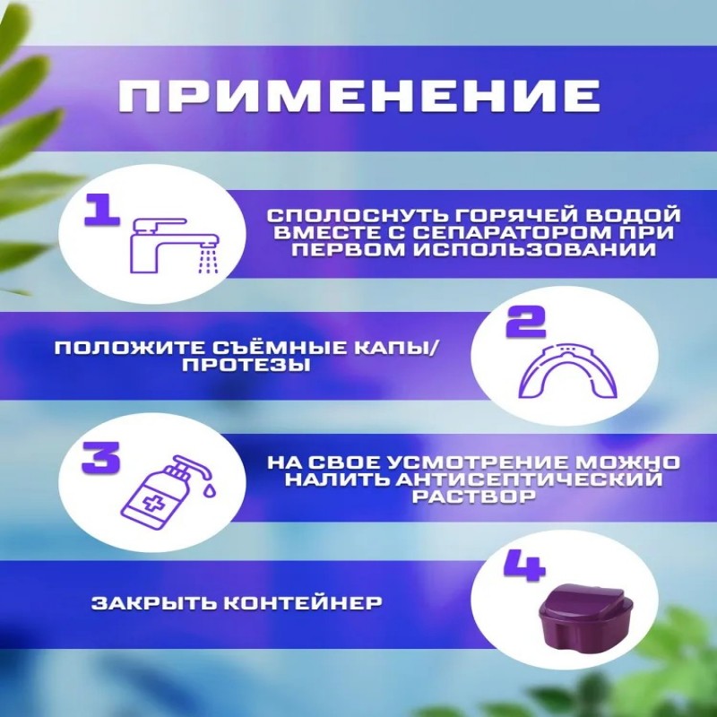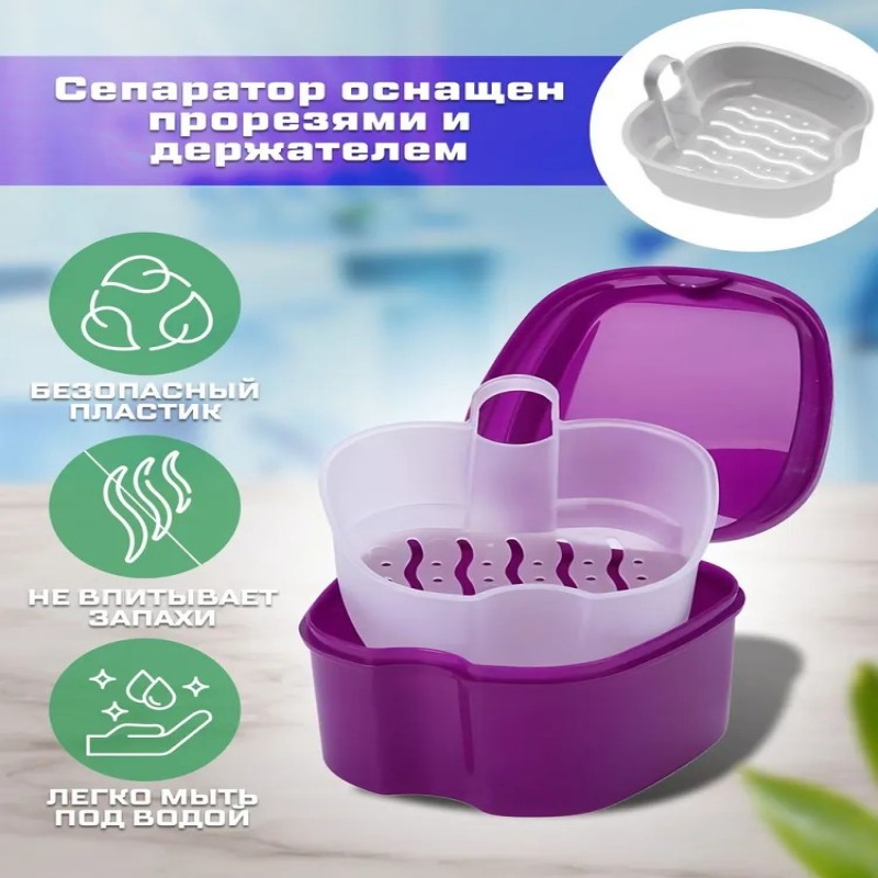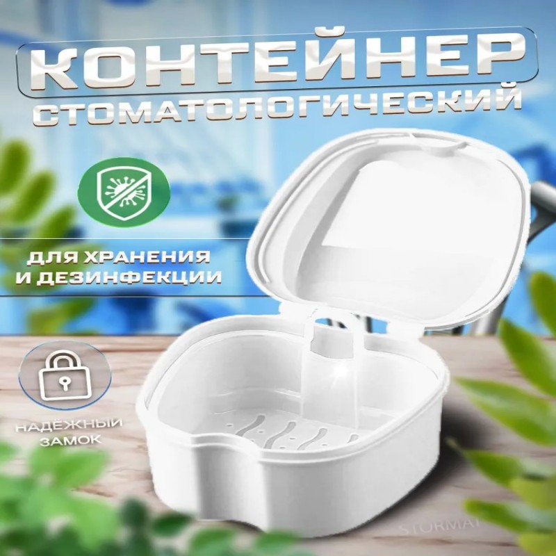 выполняет дезинфекцию бактерии и микробов, а также транспортировку ваших ортодонтических конструкций. Стоматологический контейнер предназначен для хранения пластинки для зубов, зубные протезы, элайнеры, виниры, пластин и можно использовать как чехол для капы. Футляр с плотной крышкой имеет сепаратор с ручкой, для легкой сушки и мытья изделий. Комплектация Контейнер для хранения зубных протезов, кап - 1шт