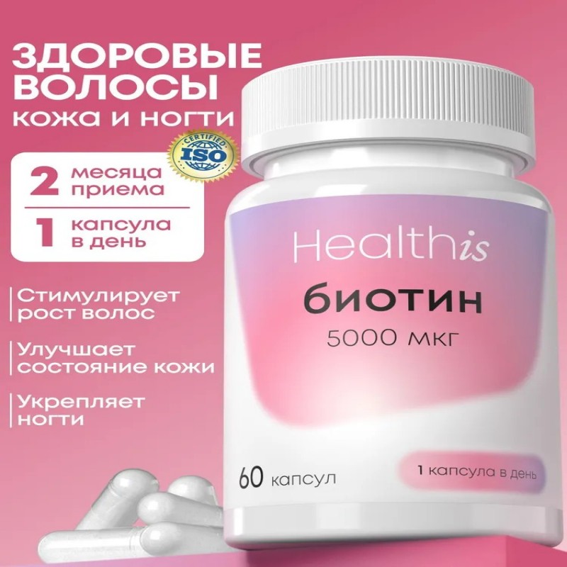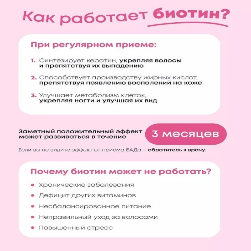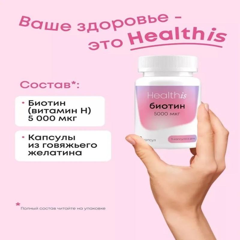 Дозировка 5000 мкг Состав микрокристаллическая целлюлоза; мальтодекстрин; оболочка капсулы (желатин говяжий); антислеживающий агент (кремния диоксид); биотин (витамин Н) Способ применения Принимать по 1 капсуле 1 раз в день во время еды или в соответствии с рекомендациями специалиста. Показания В качестве дополнительного источника витамина Н