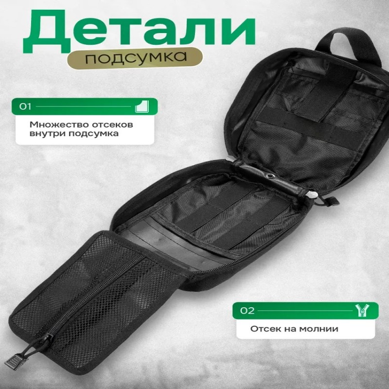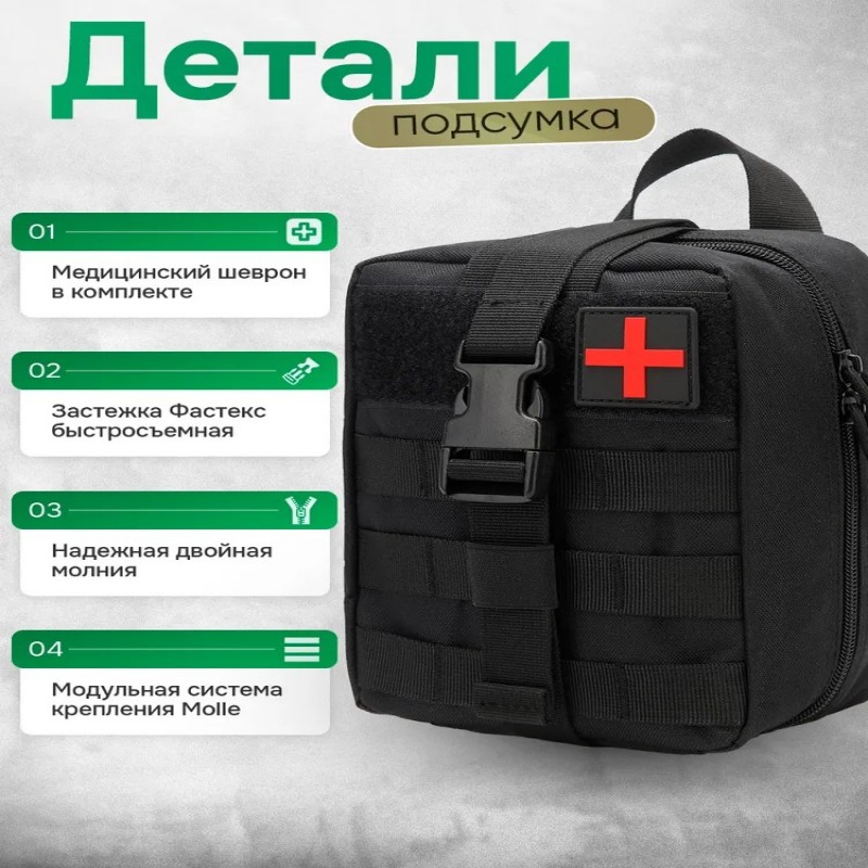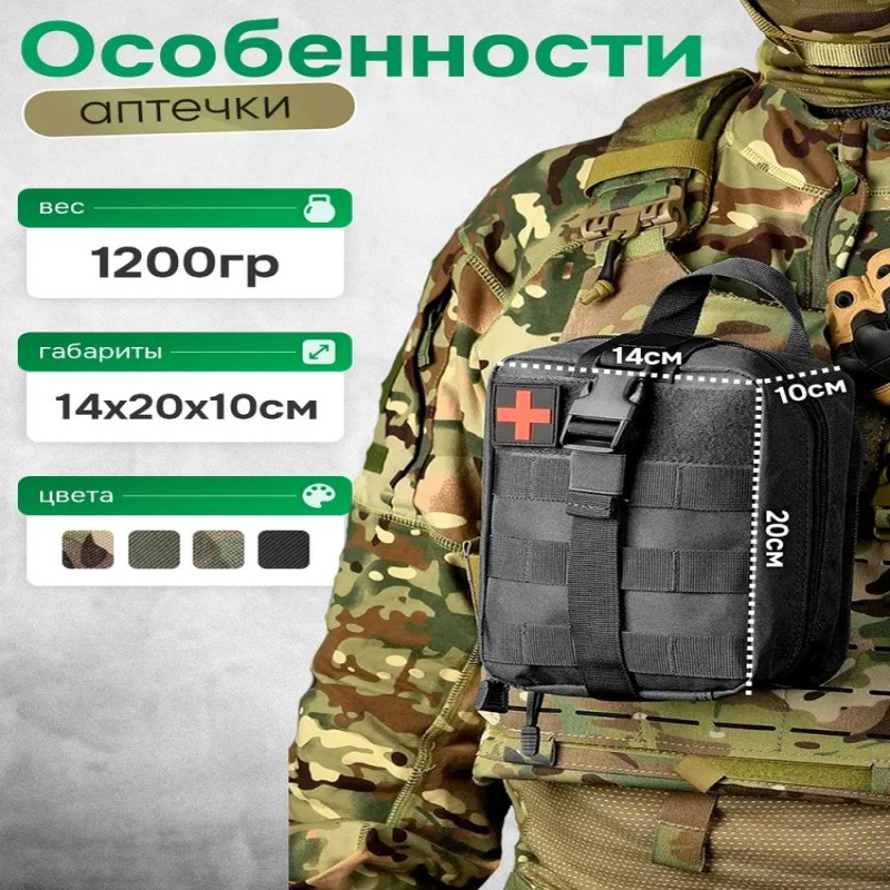 Наша водонепроницаемая аптечка предназначена для оказания первой медицинской помощи в полевых условиях при различных ранах и травмах, при ведении боевых действий и не только. Набор для выживания военнослужащего выполнен из качественных материалов. Аптечка первого эшелона послужит надежным контейнером для хранения лекарств, таблеток, витамин и медикаментов. Походная туристическая сумка большая и вместительная. Подсумок отрывной можно подвесить на пояс. Часть этих вещей можно использовать и в домашней или автомобильной маленькой аптечке. Будет хорошим подарком как для автомобилиста, находящегося часто дороге, так и для путешественника, увлекающегося туризмом. Комплект первой помощи ситуаций станет спасением при чрезвычайных ситуациях во время похода, охоты, кемпинга, путешествий, готов для служб быстрого реагирования и СВО. Создана для любителя экстремальных видов спорта, туристов, водителей, военных. КОМПЛЕКТАЦИЯ АПТЕЧКИ (100 предмета): 1) Жгут турникет кровоостанавливающий 2) Израильский бандаж 3) Ножницы тактические 4) Термоодеяло 5) Бинт марлевый 5м х 10см 6) Маркер перманентный 7) Аквабриз таблетки 10шт 8) Йодовые палочки 10шт 9) Салфетки марлевые 10шт 10) Средство кровоостанавливающее 11) Медицинский скотч 12) Салфетки антибактериальные 20шт 13) Лейкопластыри 72х19мм 20шт 14) Булавки 10шт 15) Инструкция в аптечке 16) Подсумок отрывной