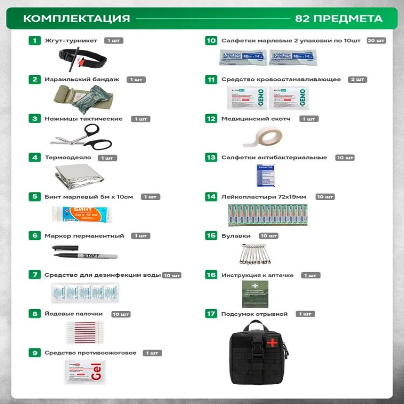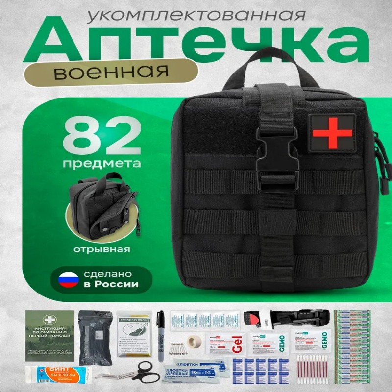 КОМПЛЕКТАЦИЯ АПТЕЧКИ (69 предмета): 1) Жгут турникет кровоостанавливающий 2) Ножницы тактические 3) Бинт марлевый 2шт 4) Компрессионный бандаж 5) Медицинский скотч 2шт 6) Стерильный гидрогель от ожогов 2шт 7) Салфетка спиртовая нестерильная 10шт 8) Воздуховод-трубка 9) Спасательное одеяло 10) Лейкопластырь бактерицидный 10шт 11) Салфетка для стимуляции дыхания 4шт 12) Салфетка марлевая стерильная 2шт 13) Ватные палочки йодовые 7шт 14) Маркер перманентный 15) Окклюзивный пластырь вентилируемый 16) Иммобилизационная шина 17) Жгуг эсмарха резиновый 18) Средство перевязочное кровоостанавливающее 2шт 19) Декомпрессионная игла 1шт 20) Повязка на глаз (окклюдер) 1шт 21) Губка гемостатическая 1шт 22) Воздуховод носовой 1шт 23) Лубрикант для воздуховода 1шт 24) Карабин тактический 2шт 25) Свисток тактический 1шт 26) Булавки 10шт 27) Бинт Z-сложенный 1шт