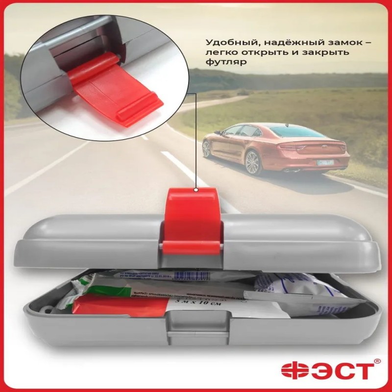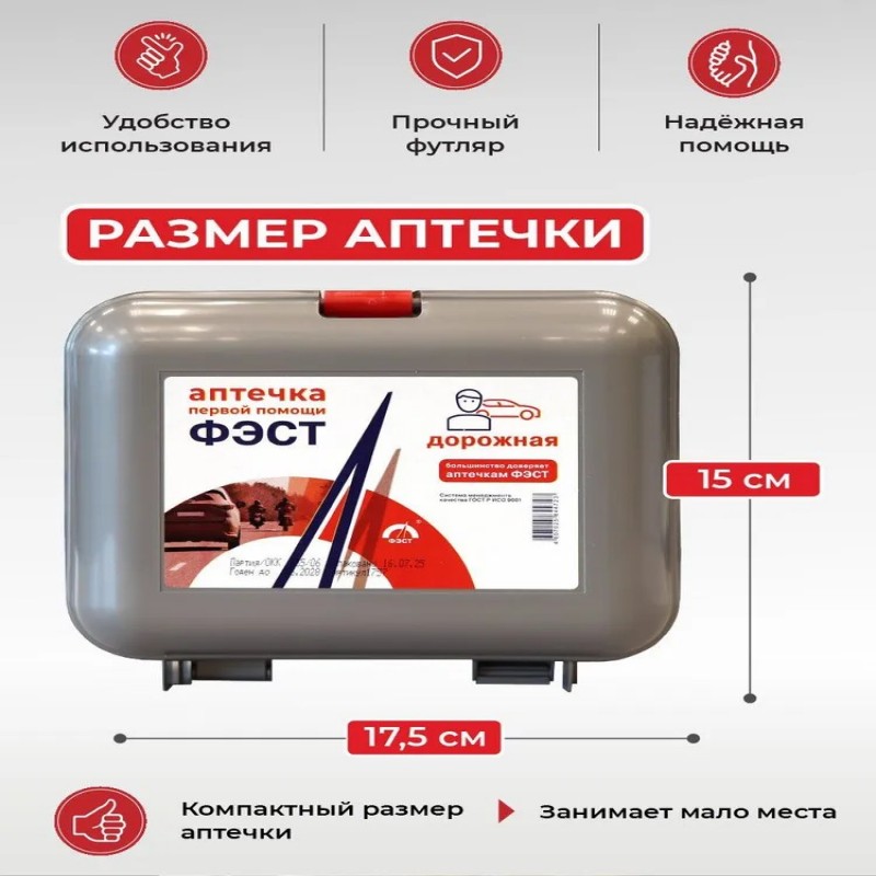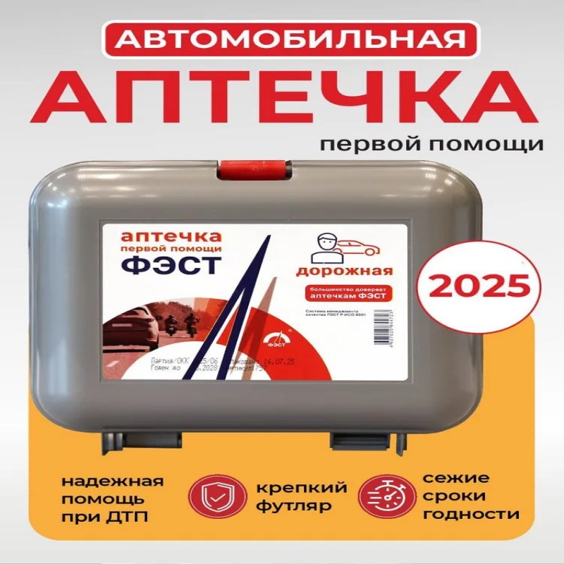 Дорожная аптечка - это незаменимый помощник в дороге во время путешествий. Аптечка первой помощи дорожная ФЭСТ и изделия медицинского назначения, входящие в ее состав, предназначены для оказания первой помощи пострадавшим, передвигающимся на транспорте: на велосипеде, мотоцикле, машине. Транспортная аптечка обеспечит первую помощь в случае несчастного случая или непредвиденных обстоятельств. Также аптечка дорожная в пластиковом кейсе может применяться для оказания первой помощи пострадавшим в ДТП при травмах, связанных с эксплуатацией автомобиля. Аптечка дорожная ФЭСТ предназначена для оснащения транспортных средств с целью своевременного оказания само- и взаимопомощи в аварийных или иных ситуациях. Используется для комплектации личных, коммерческих и грузовых автомобилей, микроавтобусов, автобусов, совершающих поездки по территории РФ, с целью своевременного оказания первой помощи Универсальная дорожная аптечка включает в себя необходимые предметы первой помощи, такие как перчатки нестерильные, устройство для проведения искусственного дыхания «рот-устройство-рот», жгут кровоостанавливающий, бинты, лейкопластырь и ножницы. Оснащение средств передвижения портативными доступными аптечками для машины позволит снизить тяжесть последствий травматизма и, если есть необходимость, обеспечить комплексную первую медицинскую помощь при различных травмах и недомоганиях. Удобный и компактный, а главное доступный дорожный транспортный набор содержит все необходимое для оказания первой помощи в автомобиле, на велосипеде, самокате или мотоцикле. Размер футляра: 275 х 150 х 70 мм. Благодаря небольшим, компактным размерам, футляр набора первой помощи в дорогу легко помещается в багажник автомобиля или в рюкзак, его с легкостью можно взять в дорожное путешествие. Автоаптечка транспортная станет надежным спутником на дороге, обеспечивая безопасность и спокойствие в любой ситуации. Подойдет для подарка начинающим автолюбителям. Аптечка в индивидуальной упаковке. Аптечка автомобильная – незаменимый аксессуар для каждого водителя, стремящегося обеспечить безопасность в пути. Это медицинская автомобильная аптечка предназначена для оказания первой помощи, разработанная с учетом всех необходимых стандартов и сертифицированная по ГОСТ. С ее помощью можно быстро решить множество непредвиденных ситуаций, которые могут возникнуть в дороге. Автомобильная аптечка 2025 сочетает современные достижения медицины с высокой функциональностью. Она подходит для использования как в автомобиле, так и во время пеших путешествий. Компактность делает ее удобной для размещения в багаже или любом транспортном средстве. Такая универсальность обеспечивает готовность к любой ситуации на дороге. Новая дорожная медицинская аптечка предназначена не только для владельцев автомобилей. Ее особенности оценят также любители активного образа жизни и частых поездок за город.