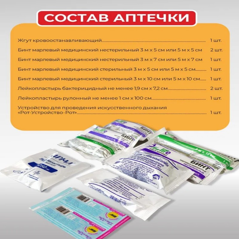 1)Жгут кровоостанавливающий - 1 шт 2)Бинт марлевый медицинский нестерильный 3 м х 5 см - 2 шт 3)Бинт марлевый медицинский нестерильный 3 м х 7 см - 1 шт 4)Бинт марлевый медицинский стерильный 5 м х 5 см - 1 шт 5)Бинт марлевый медицинский стерильный 3 м х 10 см 6)Лейкопластырь бактерицидный 1,9 см х 7,2 см - 2 шт 7)Лейкопластырь рулонный 1 м х 100 см 8)Устройство для проведения искусственного дыхания "Рот-Устройство-Рот" - 2 шт 9)Инструкция 10)Футляр пластиковый