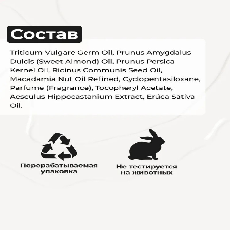 Triticum Vulgare Germ Oil, Prunus Amygdalus Dulcis (Sweet Almond) Oil, Prunus Persica Kernel Oil, Ricinus Communis Seed Oil, Macadamia Nut Oil Refined, Cyclopentasiloxane, Parfume (Fragrance), Tocopheryl Acetate, Aesculus Hippocastanium Extract, Erúca Sativa Oil.