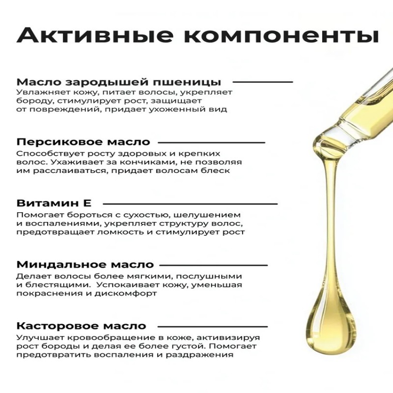 Благодаря сочетанию масел, масло для бороды возвращает волосам естественный блеск и шелковистость. Масло зародышей пшеницы и касторовое масло создают защитную пленку, предотвращая ломкость и придавая бороде ухоженный вид. Регулярное использование масла помогает достичь мягких и гладких волос, делая их более послушными.