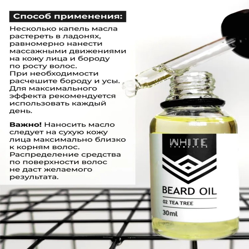 Несколько капель масла разотрите в ладонях, равномерно нанесите массажными движениями на кожу лица и бороду по росту волос. При необходимости расчешите бороду и усы. Для максимального эффекта рекомендуется использовать каждый день.