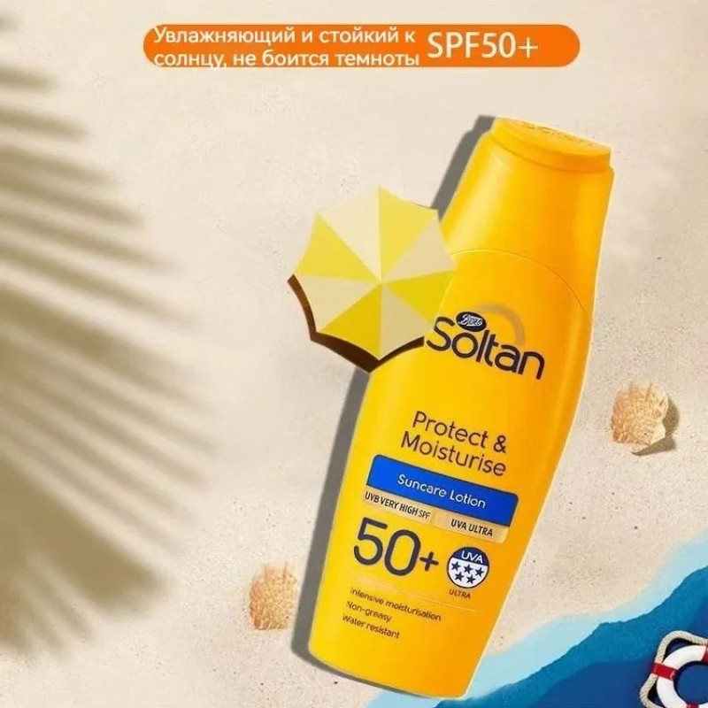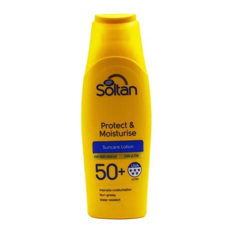 Лосьон Soltan Protect & Moisturise SPF50+ (тюбик объемом 200 мл) обеспечивает повышенную защиту кожи от долговременных повреждений и преждевременного старения.