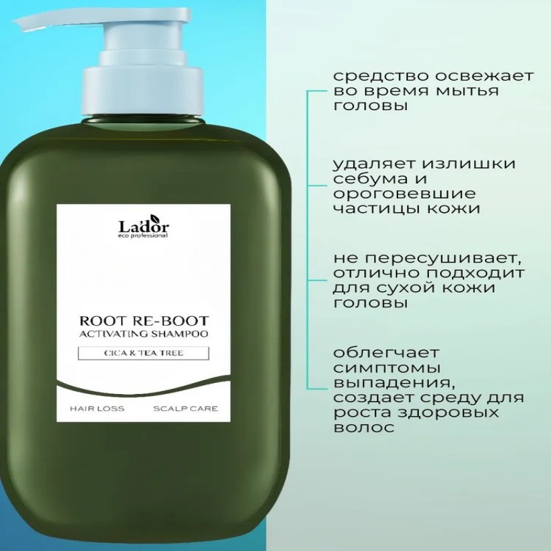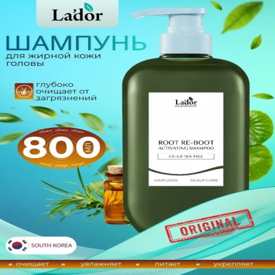 Шампунь La'dor Root Re-Boot Activating Cica and Tea Tree - это профессиональное решение для тех, кто мечтает о здоровых и густых волосах. Его формула, обогащенная экстрактами цика и чайного дерева, глубоко очищает кожу головы, эффективно борется с излишней жирностью и стимулирует рост волос. Объем 800 мл обеспечит длительный уход за вашими волосами. Шампунь подходит для всех типов волос, в том числе для склонных к выпадению и жирных.