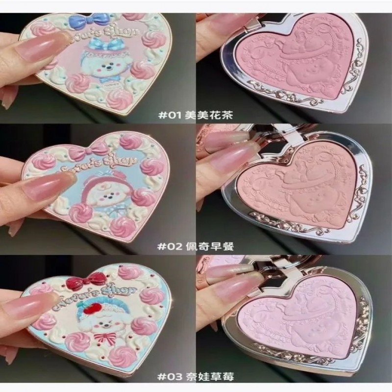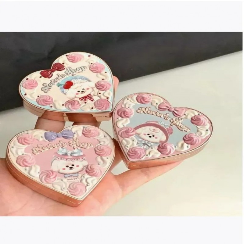 Каждая румяна – в **сердечном корпусе** с 3D-рельефом “Never’s Shop”: пушистый пёс, розовые ватышки, милые бантики… Вся палитра словно из “кулинарного сюрприза” – при виде хочется улыбнуться и попробовать на вкус!