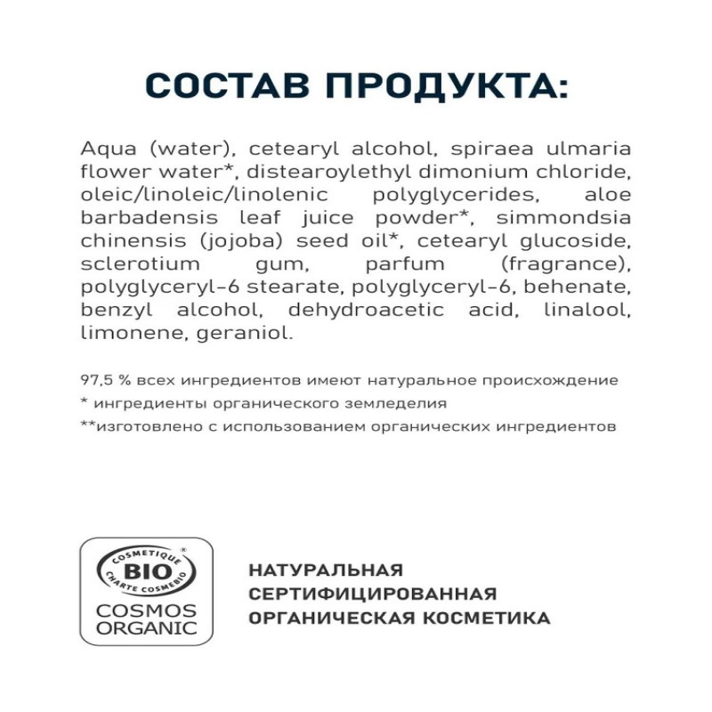 "aqua (water), cetearyl alcohol, spiraea ulmaria flower water*, distearoylethyl dimonium chloride, oleic/linoleic/linolenic polyglycerides, aloe barbadensis leaf juice powder*, simmondsia chinensis (jojoba) seed oil*, cetearyl glucoside, sclerotium gum, parfum (fragrance), polyglyceryl-6 stearate, polyglyceryl-6, behenate, benzyl alcohol, dehydroacetic acid, linalool, limonene, geraniol. 98 % всех ингредиентов имеют натуральное происхождение * ингредиенты органического земледелия"