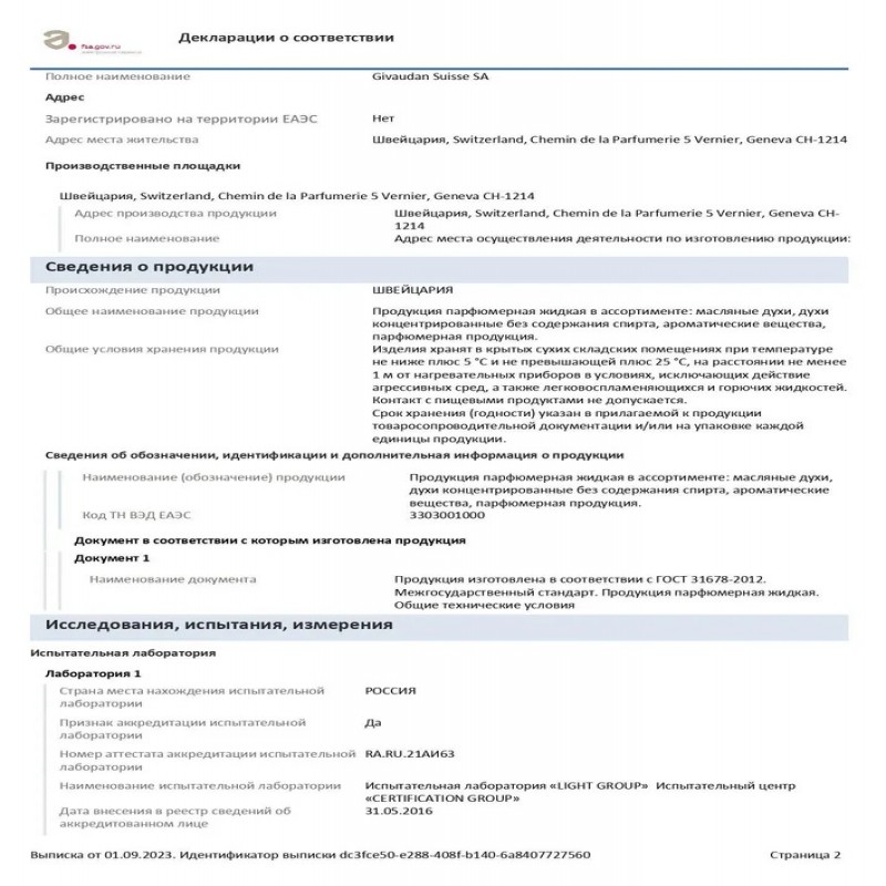 Производитель масла: Givaudan Suisse SA- швейцарская парфюмерная фабрика