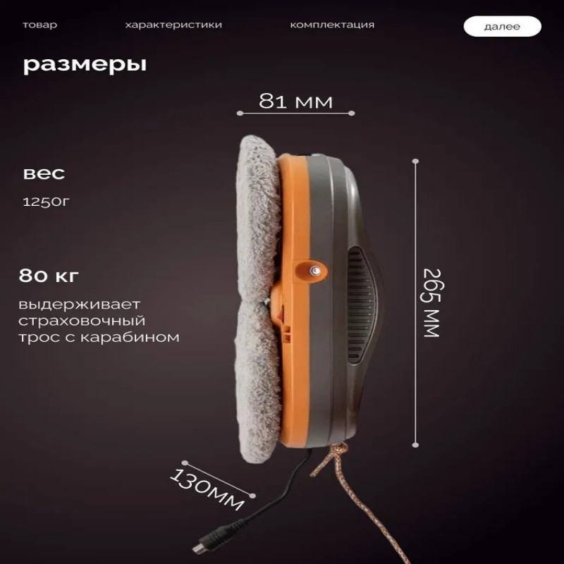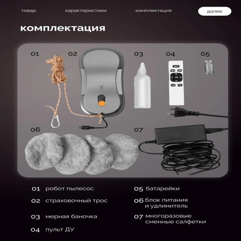 Комплектацияробот, чистящие салфетки, флакон для воды/моющего средства, емкость для воды