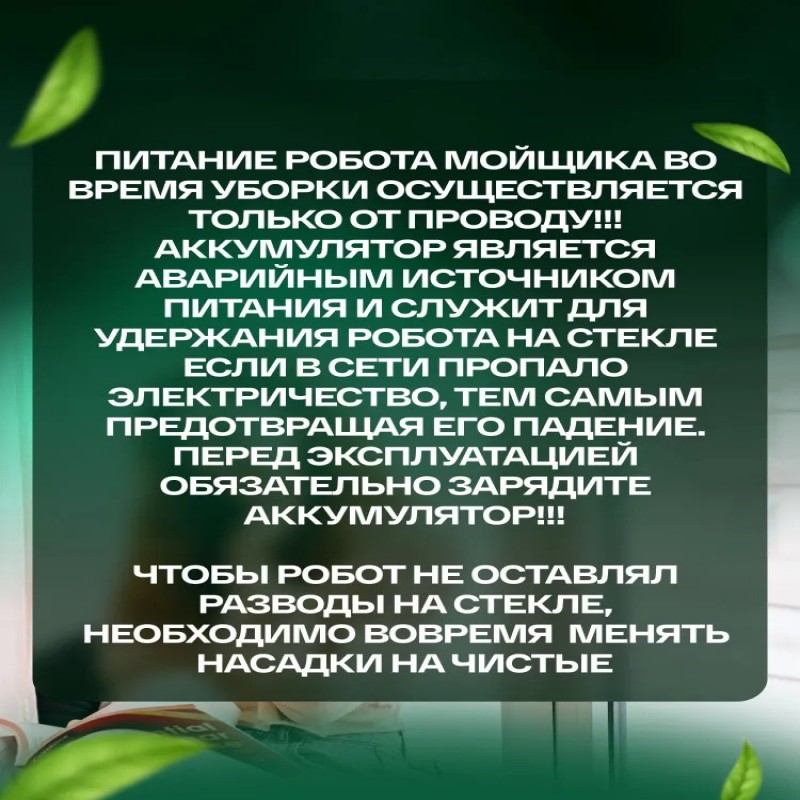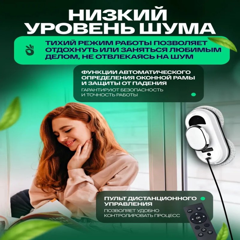 Комплектация Робот для мойки окон: 1 шт. Сменные тканевые насадки: 10 шт. Пульт дистанционного управления: 1 шт. Страховочный трос: 1 шт. Переходник зарядка: 1 шт. Кольца для чистки: 2 шт. Инструкция по эксплуатации на английском и русском: 1 шт.