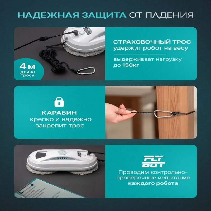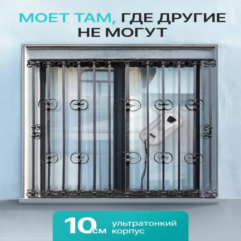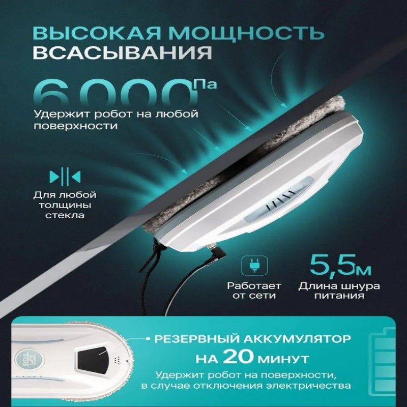 КомплектацияРобот для мойки окон, сменные салфетки для робота-мойщика окон 10 шт, страховочный трос 4 метра, пульт дистанционного управления, адаптер питания с кабелем 5,5 метра, 2 запасных кольца, инструкция, коробка.