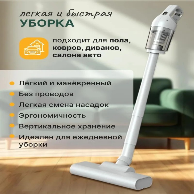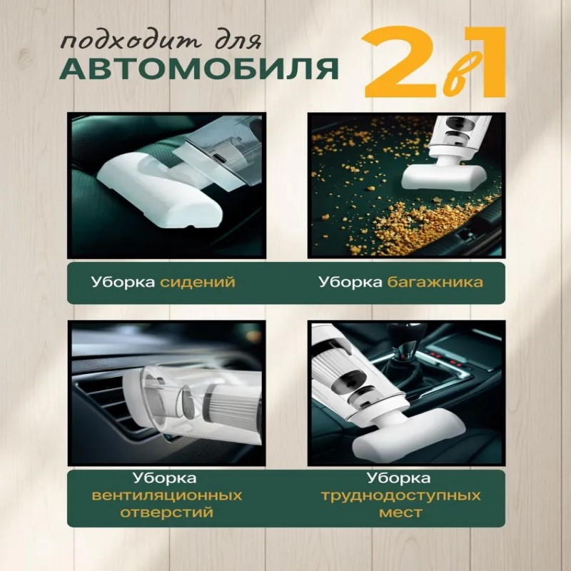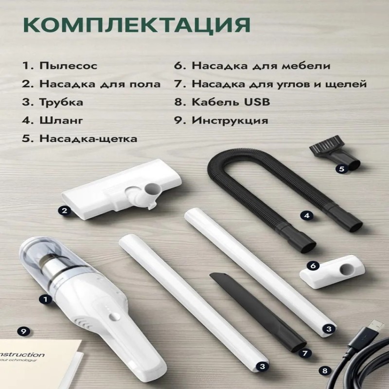 Комплектация1. Коробка - 1шт 2. Удлинитель для насадок- 2 шт 3. Соединительные трубки- 2шт 4. Насадка для щелей-1шт 5. Насадка для пола широкая- 1шт 6 Насадка для пола узкая- 1шт 7. Пылесос-1 шт 7. USB зарядка- 1шт
