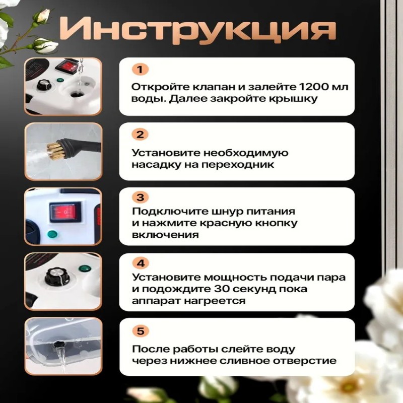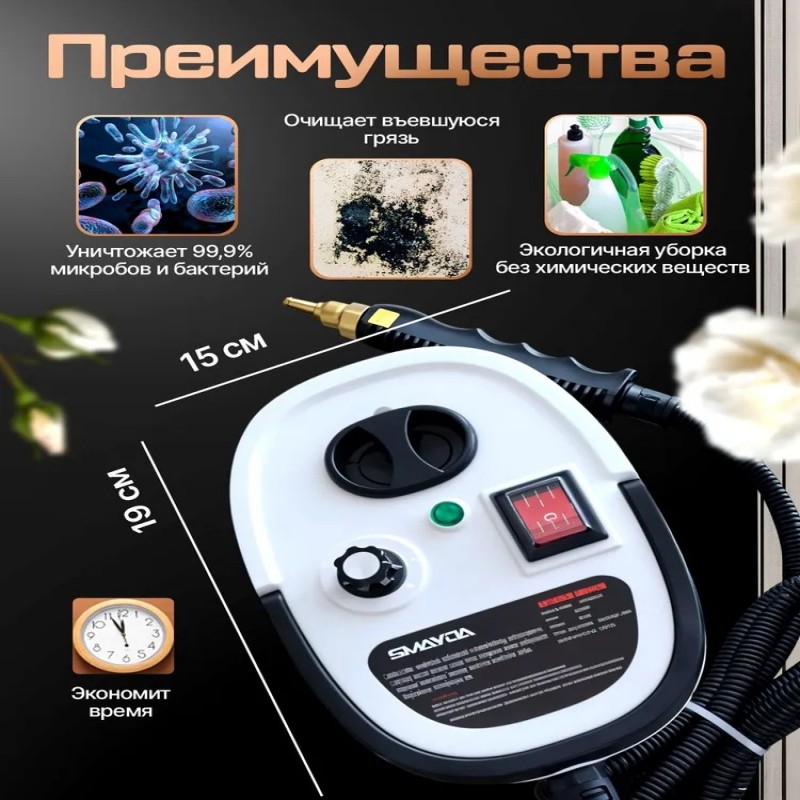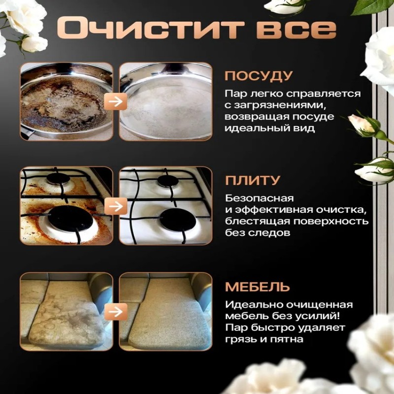 КомплектацияПароочиститель для уборки дома Насадка скребок - 2 Мягкие щетки - 2 Сопло - 1 Угловая насадка - 1 Стальная щетка - 1 Оконный скребок - 1 Салфетка для оконного скребка - 1 Распылитель - 1 Инструкция Фирменная коробка