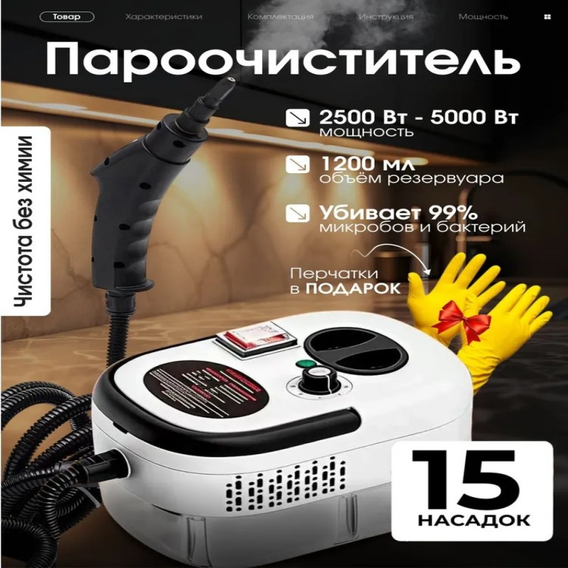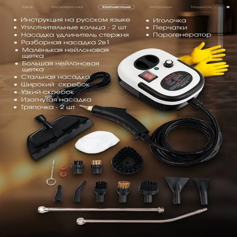 КомплектацияПароочиститель; 15 насадок; Перчатки; Инструкция на русском языке.