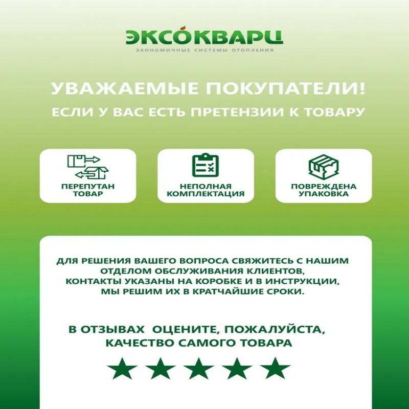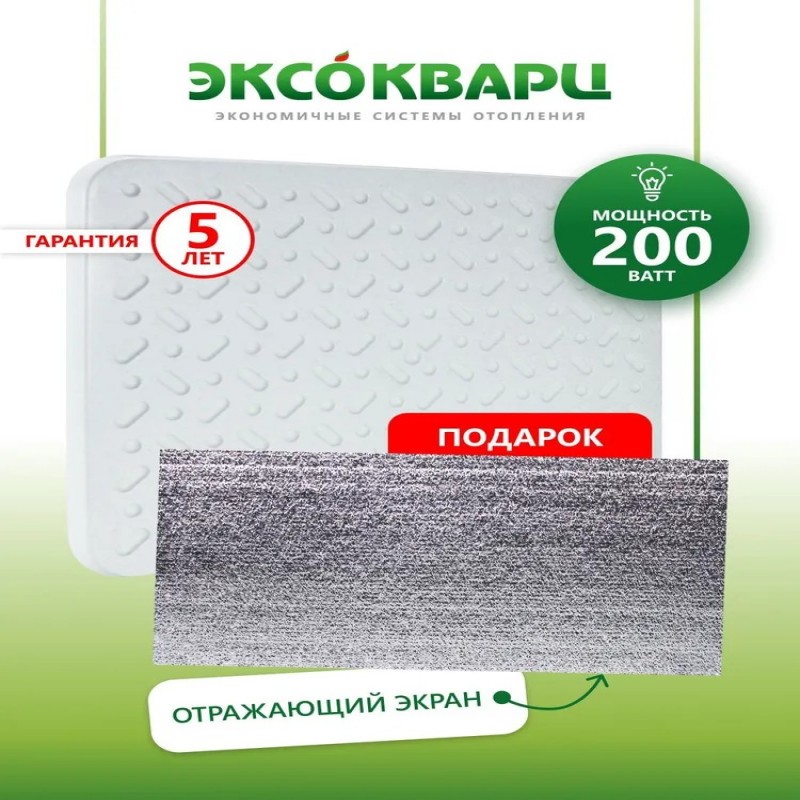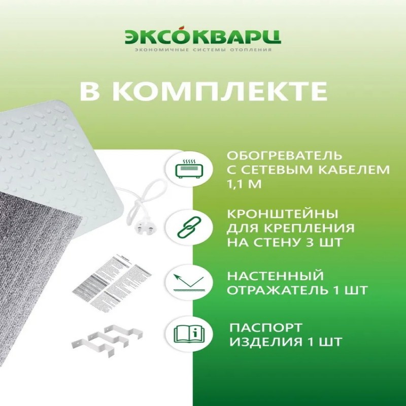 Комплектация: Кварцевый обогреватель - 1шт., отражающий экран - 1 шт., паспорт - 1шт., кронштейн для крепления к стене - 3шт., коробка - 1шт.