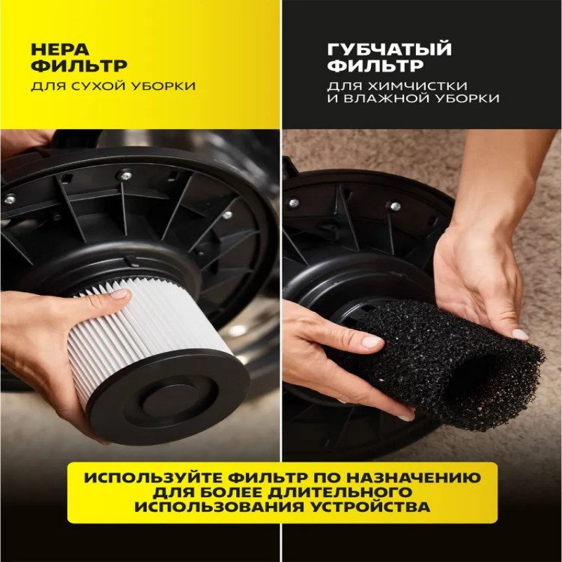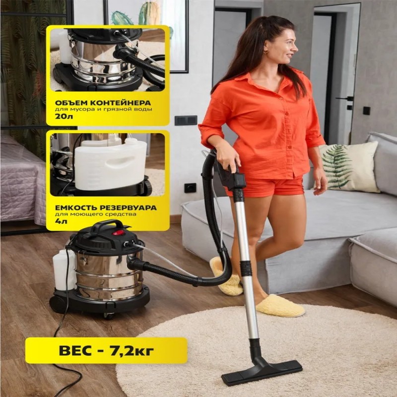 КомплектацияКомплектация: - Всасывающий шланг 2,5 м. - 1 шт. - Удлинительная трубка - 2 шт. - Губчатый фильтр - 1 шт. - Гребенчатый фильтр - 1шт. - Насадка для химчистки ковров и твердых покрытий - 1 шт. - Ручная насадка для химчистки - 1 шт. - Насадка напольная для сухой уборки - 1 шт. - Насадка щелевая - 1 шт. - Щетка - насадка - 1 шт.