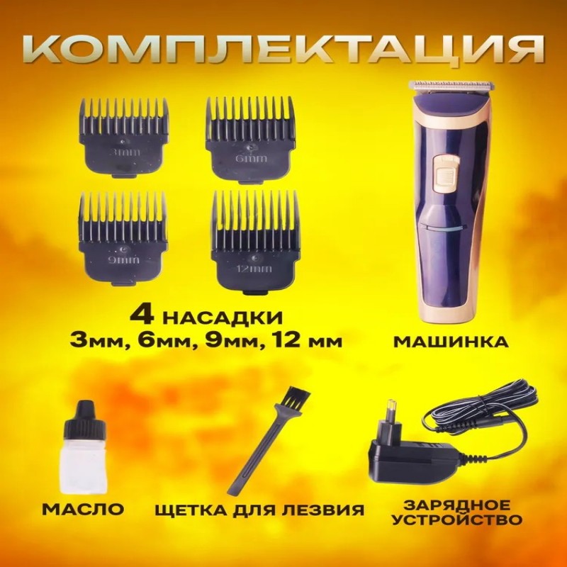 4 насадки 3mm,6mm,9mm,12mm , масло для чистки лезвия , щетка для чистки лезвия , зарядка