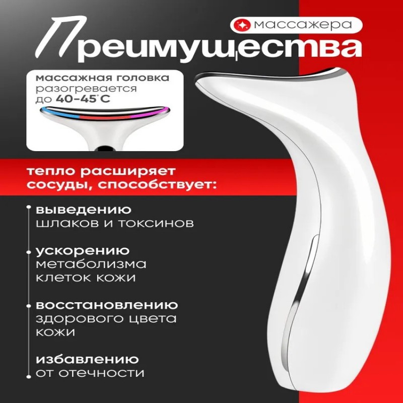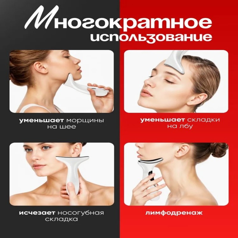 Три режима мощности Четыре программы, которые опишем ниже Очистить кожу лица и шеи перед процедурой. 1. Первый режим. Синий свет активирует, подтягивает и расслабляет кожу, сужает поры, отлично подходит для жирной кожи, улучшение состояния чувствительной кожи. 2. Второй режим. Красный свет ускоряет кровообращение и способствует росту фибробластов и коллагена, разглаживает тонкие линии морщин, укрепляет кожу, осветляет пигментацию. 3. Третий режим. Фиолетовый свет улучшает снабжение клеток кислородом, разгоняет лимфу и устраняет отеки. 4. четвертый режим. Микротоки. EMS - прерывистые импульсные токи повышают элостичность мышечных волокон лица, активизируют выработку коллагена, укрепляют кожу. На режиме EMS Медленно водите массажную головку, задерживая до 3-5 секунд на одном месте, плотно прижимая к коже. Так как все люди разные, кожные покровы на лице и шеи тоже различаются. Чувствительность, плотность кожных покровов у каждого индивидуальна. Соответственно и микротоки будут ощущаться по разному, а возможно и совсем не будут. Если вдруг такое происходит - это НЕ означает, что их нету и эффективность процедуры снижается - это вполне нормальное явление. Максимально, что вы можете ощутить, это легкие покалывания, никаких сокращений(стимуляций) мышц быть НЕ может. Для проверки токов, можно приложить массажер под глазами, где тонкая кожа.
