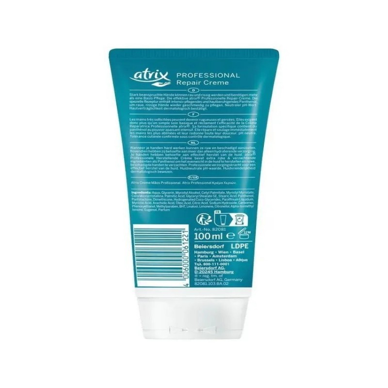 Состав Aqua, Glycerin, Myristyl Alcohol, Cetyl Palmitate, Myristyl Myristate, Cera Microcristallina, Palmitic Acid, Glyceryl Stearate SE, Stearic Acid, Panthenol, Pantolactone, Dimethicone, Hydrogenated Coco-Glycerides, Paraffinum Liquidum, Myristic Acid, Arachidic Acid, Oleic Acid, Citric Acid, Sodium Hydroxide, Carbomer, Phenoxyethanol, Methylparaben, BHT, Linalool, Limonene, Citronellol, Alpha-Isomethyl Ionone, Eugenol, Parfum Профессиональный восстанавливающий крем от Atrix особенно интенсивно ухаживает за грубыми и потрескавшимися руками. Экстра-сильный крем для рук содержит успокаивающий кожу пантенол и делает поврежденные руки снова эластичными и мягкими.