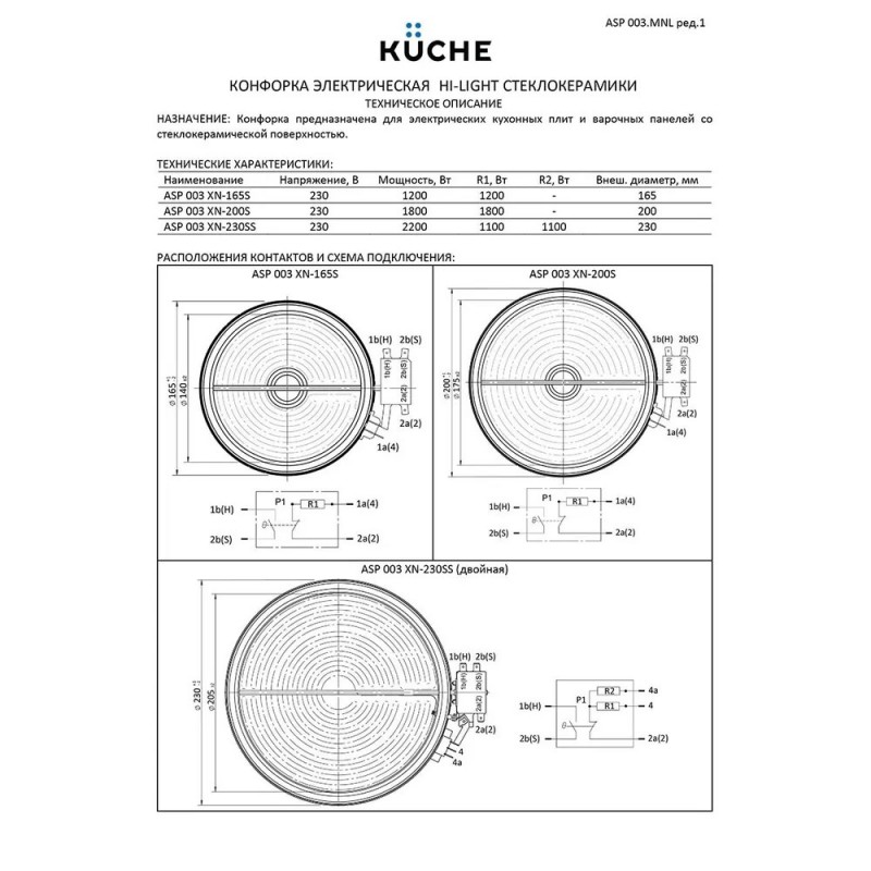Диаметр165 мм. Высота: 31 мм. Полная потребляемая мощность: 1200 Вт. Напряжение, частота 230 В/50 Гц. Конфорка оборудована функцией Защита от перегрева и Индикатором остаточного тепла.