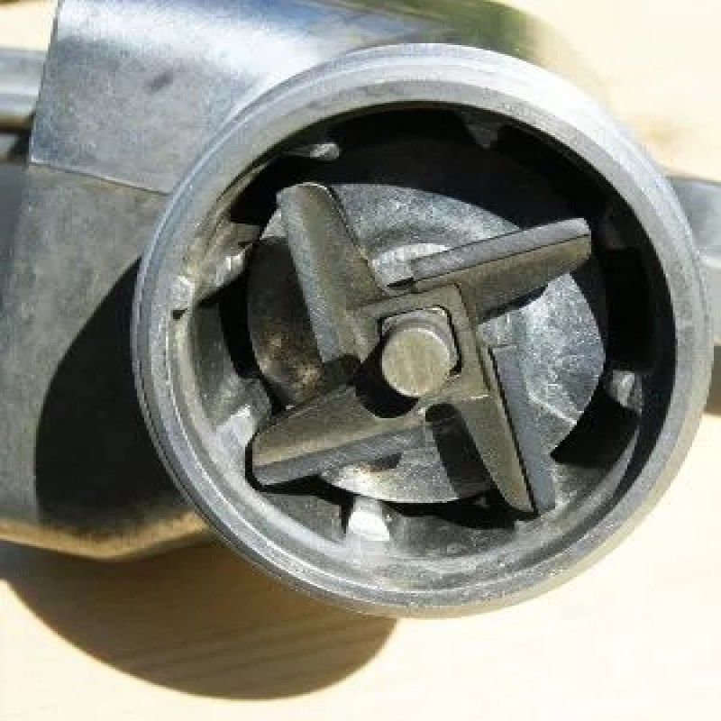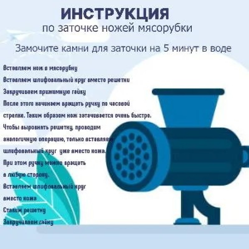 Чтобы заточить нож, нужно вставить его в мясорубку, потом, вместо решетки вставить шлифовальный круг и закрутить прижимную гайку, но не очень плотно.