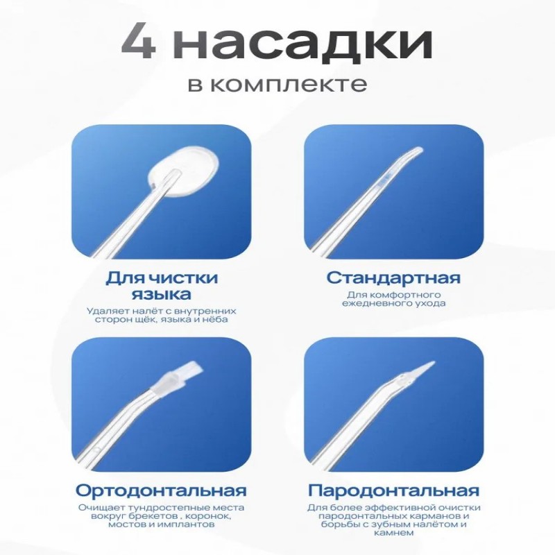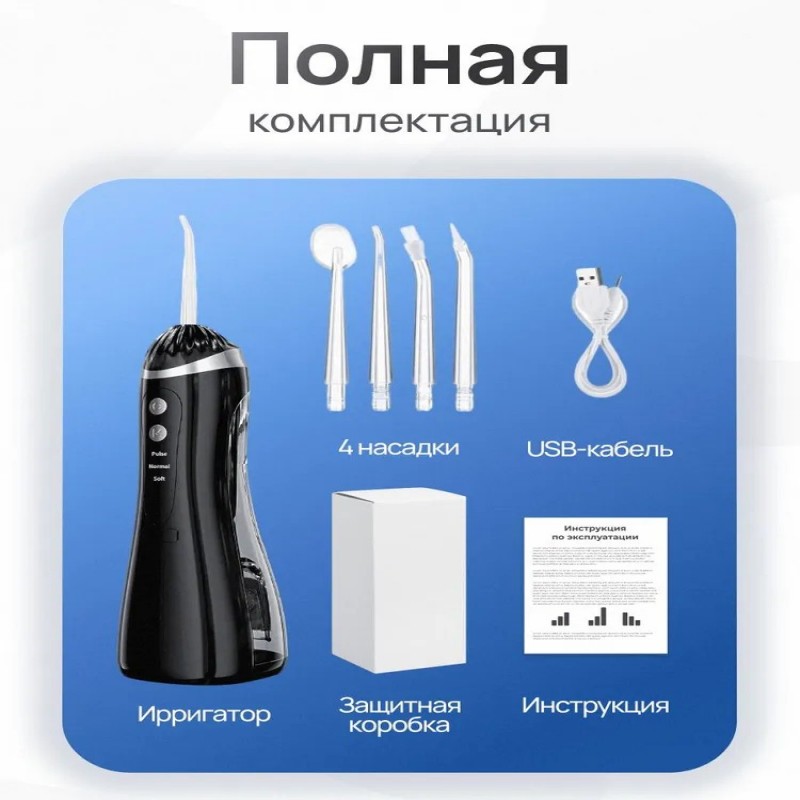 Комплектация1. Ирригатор 2. Насадки - 4 штуки 3. USB Type-C кабель