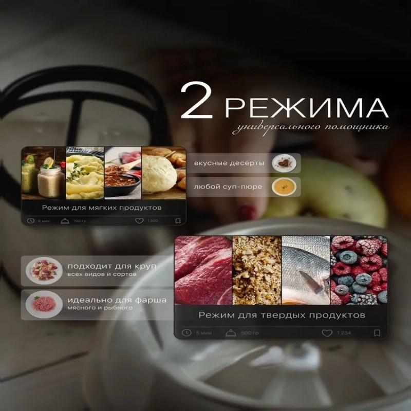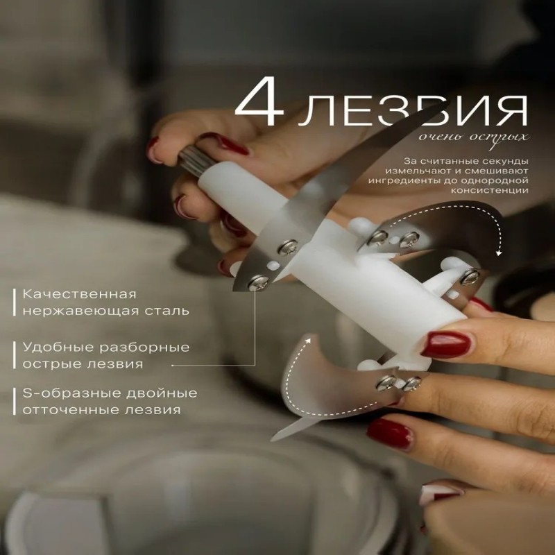 Комплектация Корпус управления, крышка, 4 лезвия, защитные насадки на лезвия, металлическая чаша объемом 2 л, силиконовое кольцо против скольжения, инструкция на русском языке