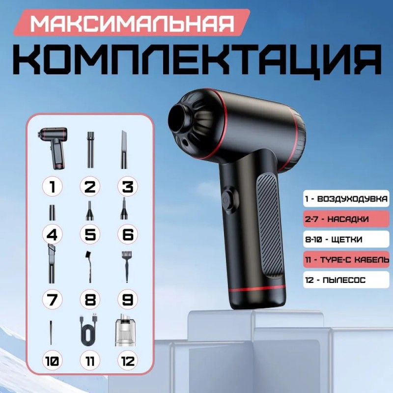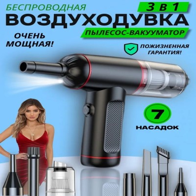 Воздуходувка пылесос для компьютера, комплект из 7 насадок и щеток, кабель для зарядки.