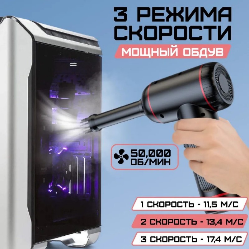 Наша воздуходувка для компьютера имеет 3 скорости работы. Благодаря этому можно подобрать наиболее подходящий для каждого случая вариант. Мощный поток воздуха выдует пыль, крошки из всех щелей; отлично прочистит системный блок, клавиатуру. Необходима такая воздуходувка и в быту: с ней любая уборка станет быстрее и эффективнее.