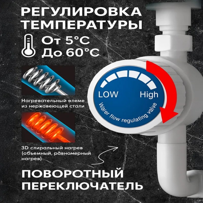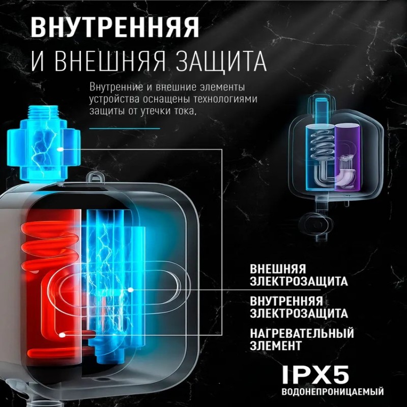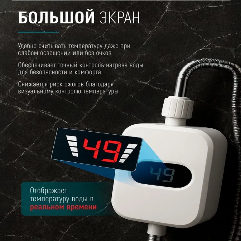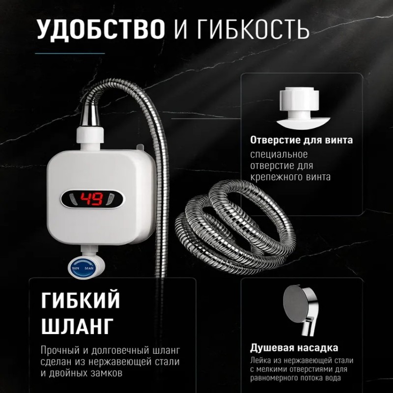 Комплектация- Нагреватель воды проточный с душем - 1 шт; - гибкий шланг - 2 шт; - Насадка лейка - 1 шт; - Комплект прокладок и креплений ;