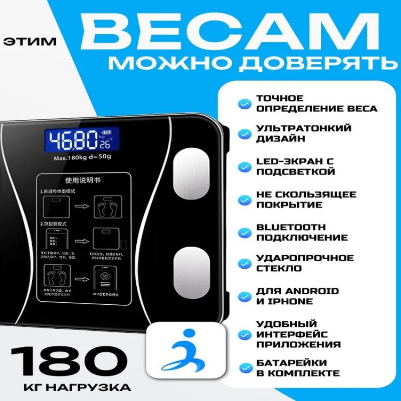 Представляем вам электронные напольные весы с технологией Bluetooth — идеальный аксессуар для контроля вашего веса и состояния здоровья. Наши умные весы напольные подходят как для домашних условий, так и для профессионального использования. Они сочетает в себе современный дизайн и высокую точность измерений, что делает их незаменимыми в вашем повседневном жизни.