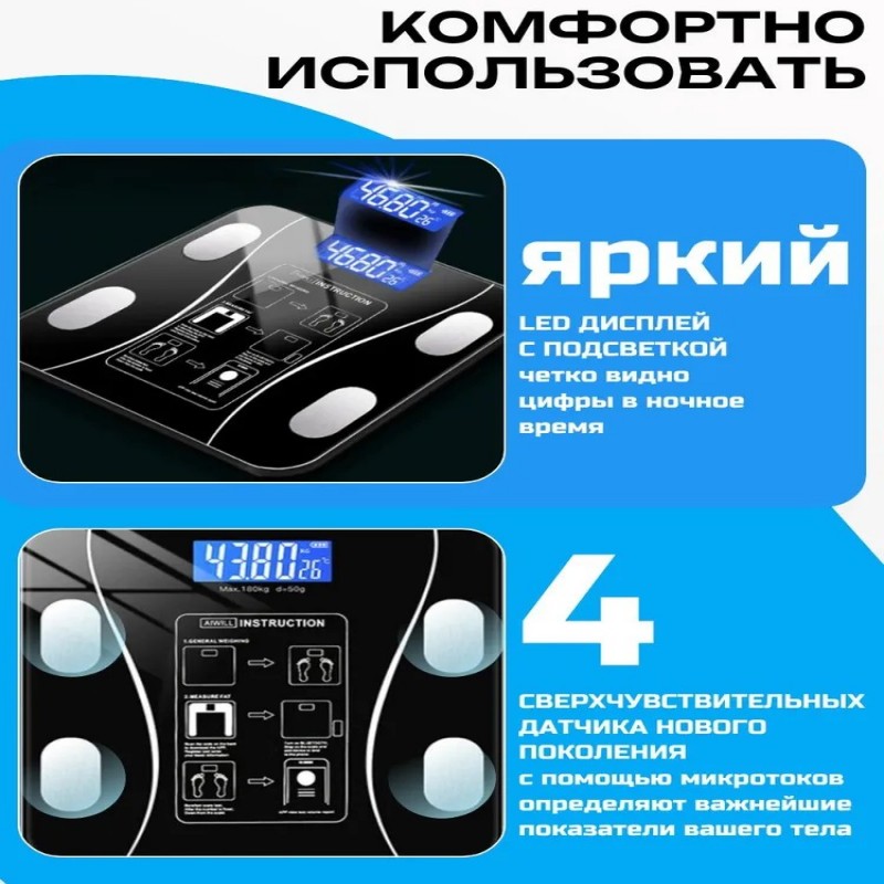 Умные весы оснащены функцией Bluetooth, что позволяет легко синхронизировать их с вашим смартфоном. С помощью специального приложения вы сможете отслеживать динамику своего веса, анализировать состав тела и получать персонализированные рекомендации по улучшению здоровья. Эти весы напольные электронные помогут вам не только контролировать свой вес, но и делать это с простотой и удобством.