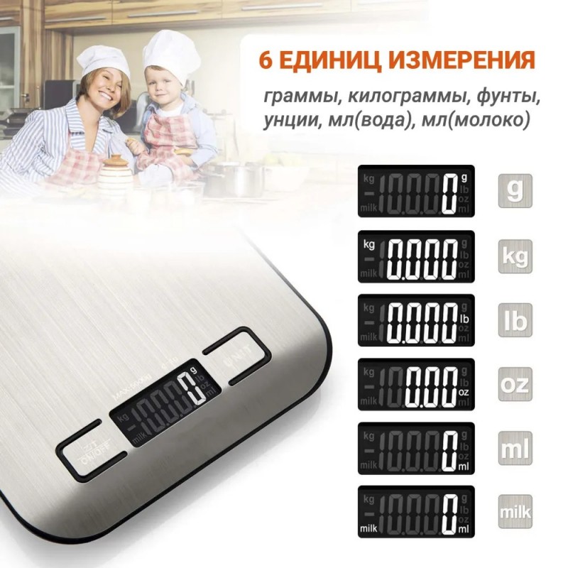 - 6 единиц измерения: миллилитры, унции, фунты, граммы.