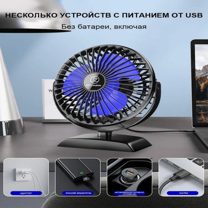Небольшой настольный вентилятор JZCreater поставляется с 3,5-футовым USB-кабелем, который работает со всеми USB-портами. Он совместим с широким спектром устройств, включая ПК / ноутбуки, мобильные источники питания, адаптеры переменного тока, автомобильные зарядные устройства и многое другое. (Примечание: В этом вентиляторе нет батарейки)