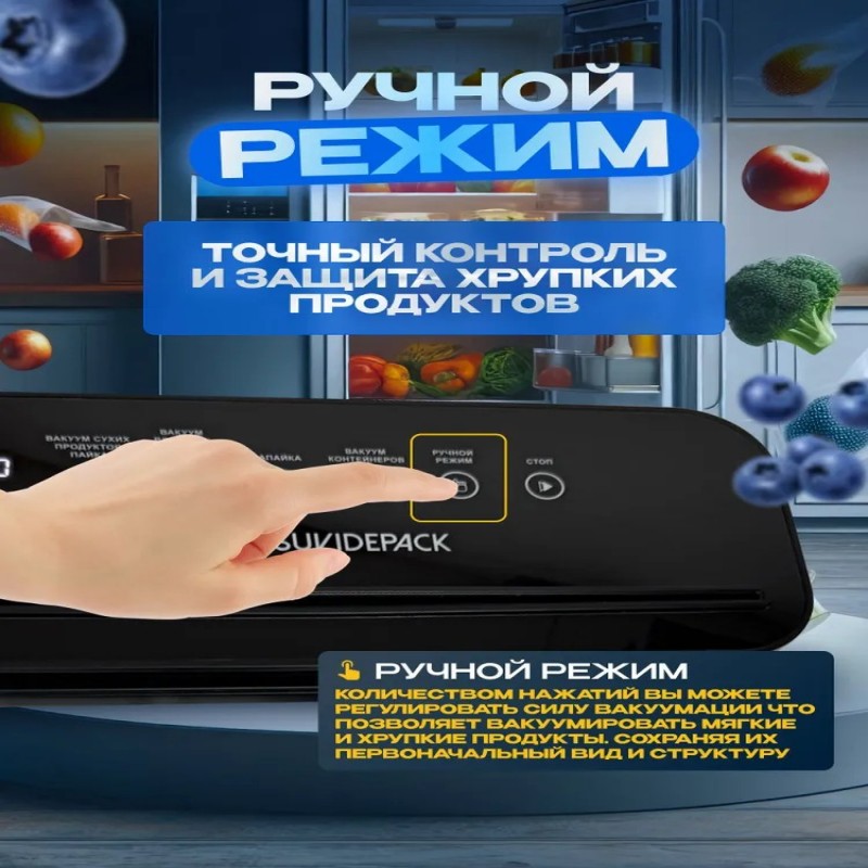 SuvidePack VS8811 оборудован сенсорной панелью управления и имеет мощность 100 Вт, обеспечивающую всасывание силой до 60 кПа. Устройство чрезвычайно просто в эксплуатации и подходит как для сухих, так и для влажных продуктов. Разнообразные рабочие режимы позволяют легко адаптировать вакууматор под ваши потребности.