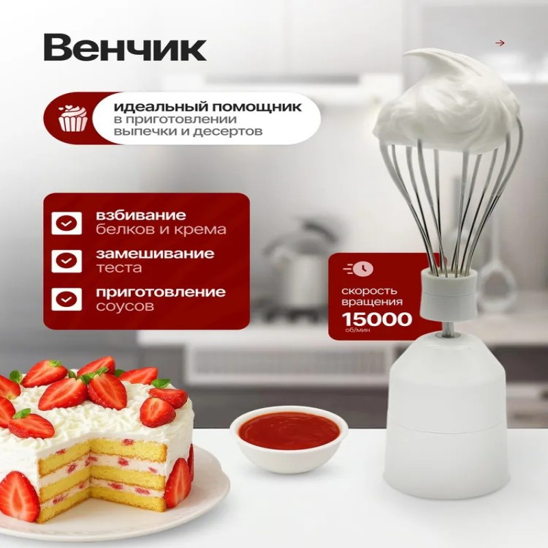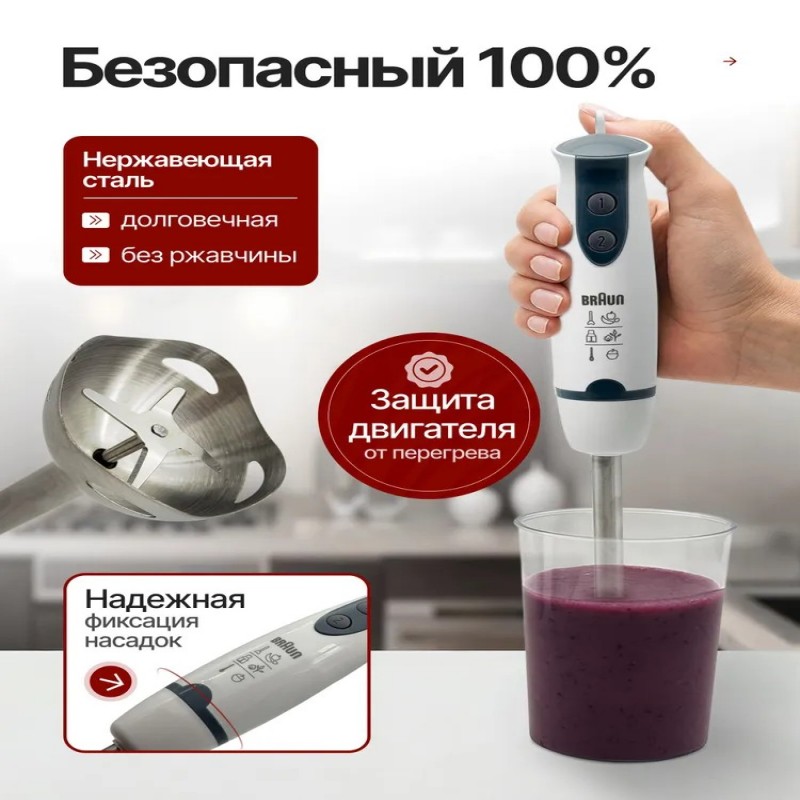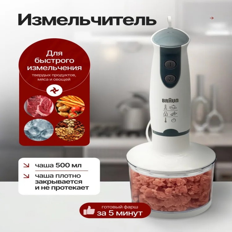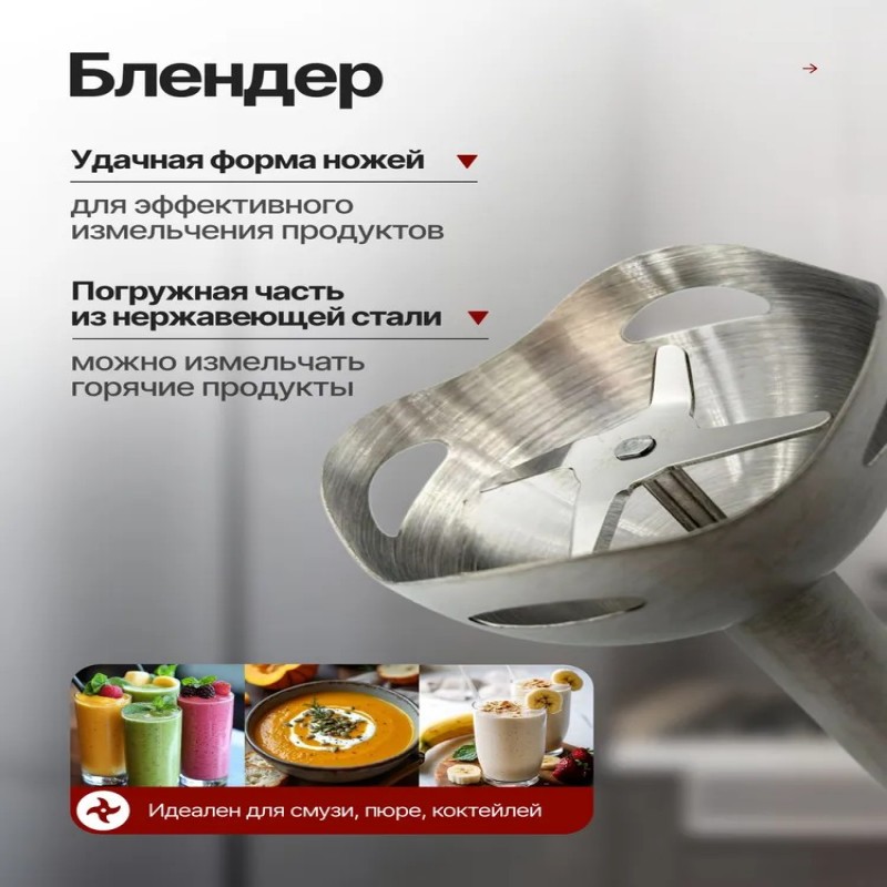 Комплектацияблендер погружной; чаша измельчителя с крышкой; мерный стакан; S-образный нож измельчителя; насадка-блендер; насадка-венчик; стакан для смешивания