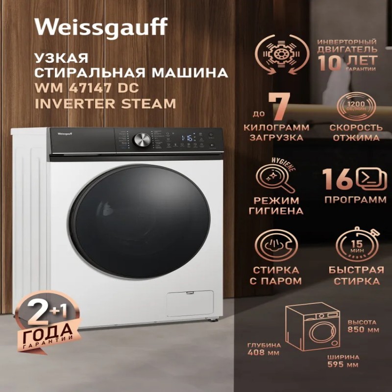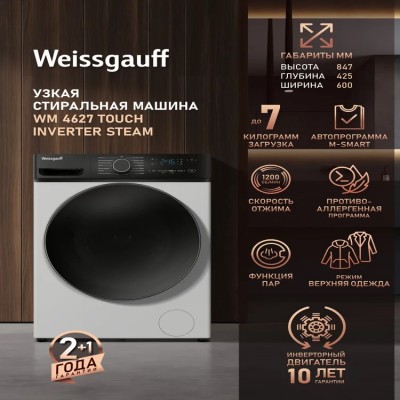 Отдельностоящая стиральная машина автомат Weissgauff оснащена современным инверторным двигателем, функцией пара и автопрограммой Smart. Также данная узкая стиралка имеет показатель загрузки до 7 кг белья и скорость отжима до 1200 оборотов в минуту - это настоящее воплощение основного принципа Weissgauff "Качество, доступное каждому"!