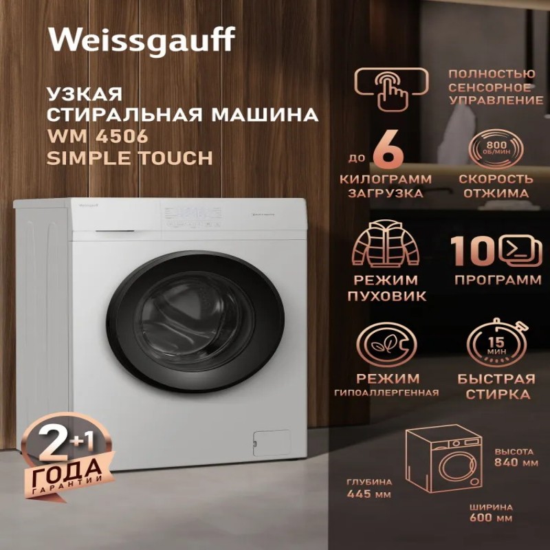 Глубина Slim 45 см - мы в Weissgauff знаем, как важна в стиральной машине не только функциональность, но и компактность. Такая глубина позволит удобно разместить эту модель даже в самой небольшой квартире!
