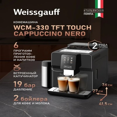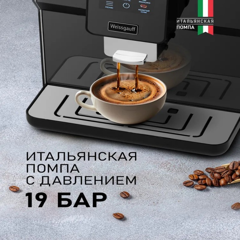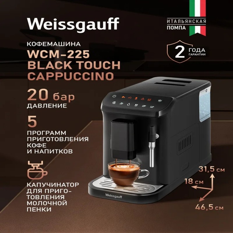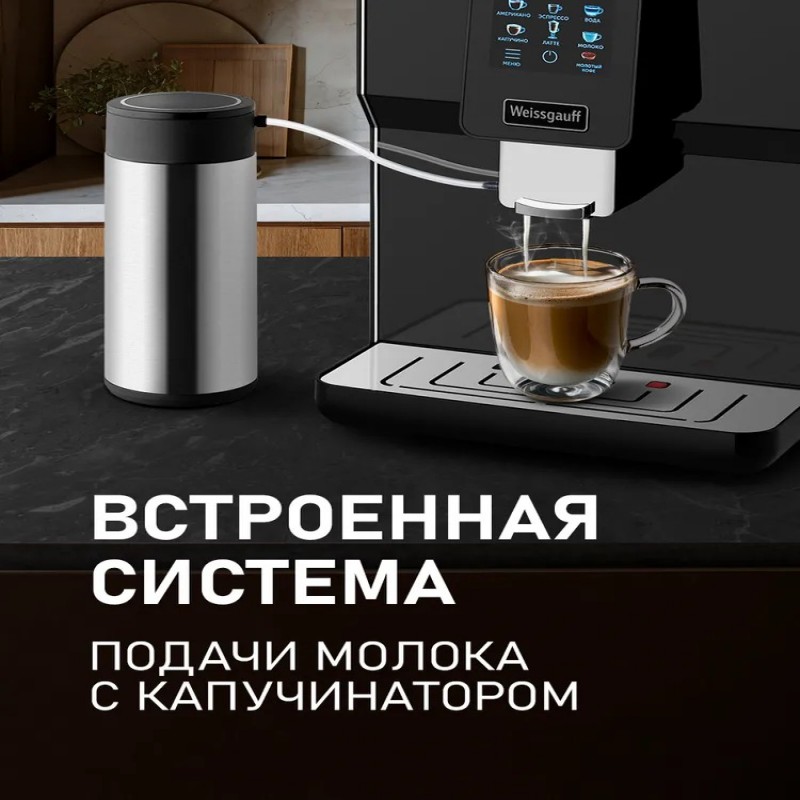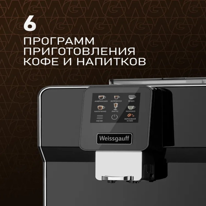 Автоматическая зерновая кофемашина от Weissgauff, выполненная в черном цвете, оснащенная вместительным контейнером для зерен на 370 грамм, обладающая цветным сенсорным дисплеем, системой подачи молока с автоматическим капучинатором, внешней емкостью для молока, а также 6 заранее предустановленными программами для приготовления ароматного вкуснейшего кофе прямо на вашей кухне!
